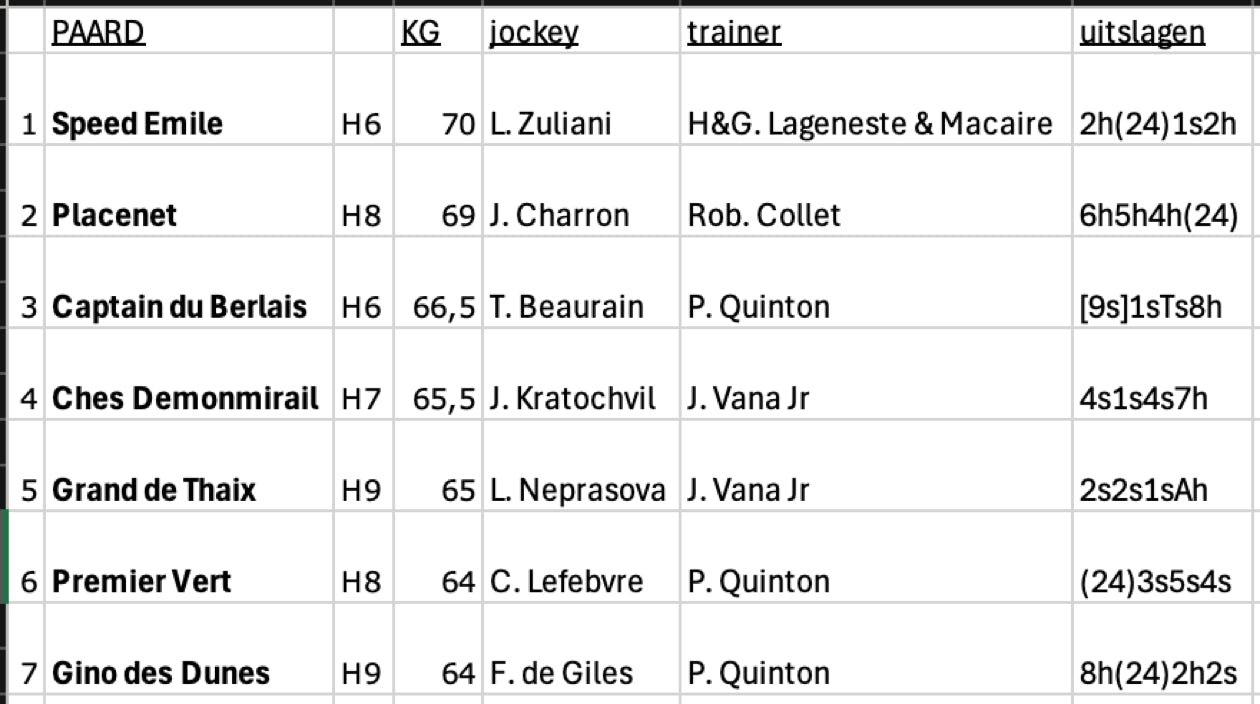 Winnaar van de Grote Steeple-chase van Vlaanderen is de Franse 6-jarige ruin Speed Emile (1) met jockey Lucas Zuliani voor trainer H&G Lageneste & Macaire. In de laatste ronde kwam Speed Emile (1) na de valpartij van Gino des Dunes naar de leiding en zijn jockey hield mooi de koord dicht om de winnaar van vorig jaar Placenet op de 2de plaats te houden.